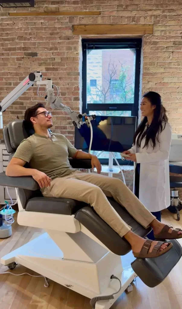 You’ll start by getting comfortably reclined in our exam chair. We’ll begin with a gentle exam of the first ear, explaining everything we’re doing as we go.